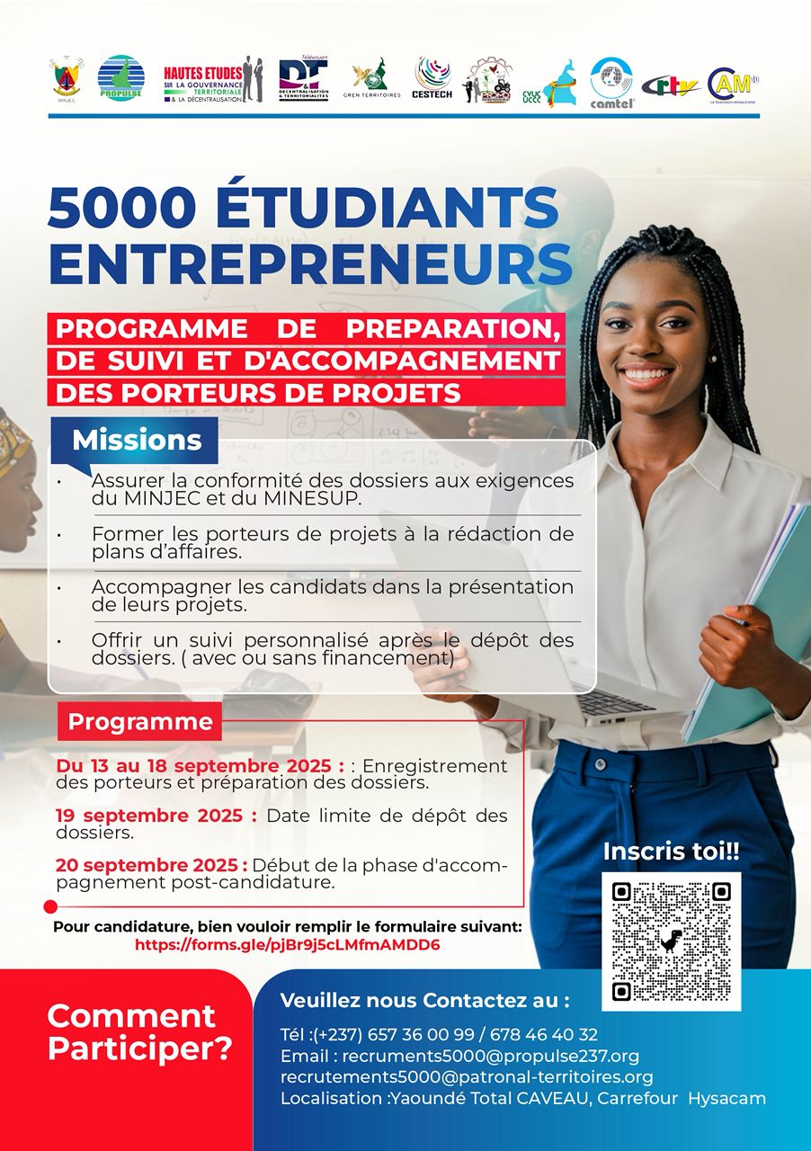 Le Réseau des Pépinières du Cameroun a l'honneur d'annoncer le lancement de son programme d'accompagnement des porteurs de projets, en soutien à l'opération "5 000 étudiants entrepreneurs" initiée par le Ministère de la Jeunesse et de l'Éducation Civique (MINJEC) et le Ministère de l'Enseignement Supérieur (MINESUP). Ce programme est conçu pour fournir un encadrement structuré et professionnel aux jeunes entrepreneurs, afin de renforcer leurs compétences et de maximiser leurs chances de succès.
